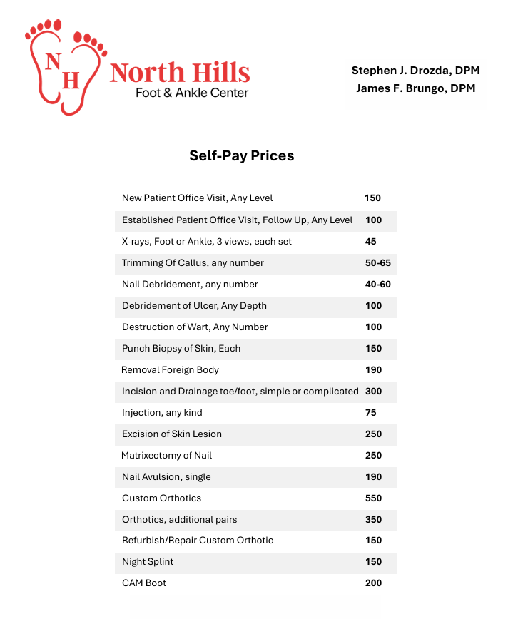 North Hills Foot and Ankle Center is committed to making healthcare transparent and affordable. If you are uninsured, paying out-of-pocket, or prefer not to use insurance, our self-pay rates offer discounted, upfront pricing often lower than insurance-negotiated rates. Call 412-369-0255 for a personalized, good-faith estimate prior to scheduling.
